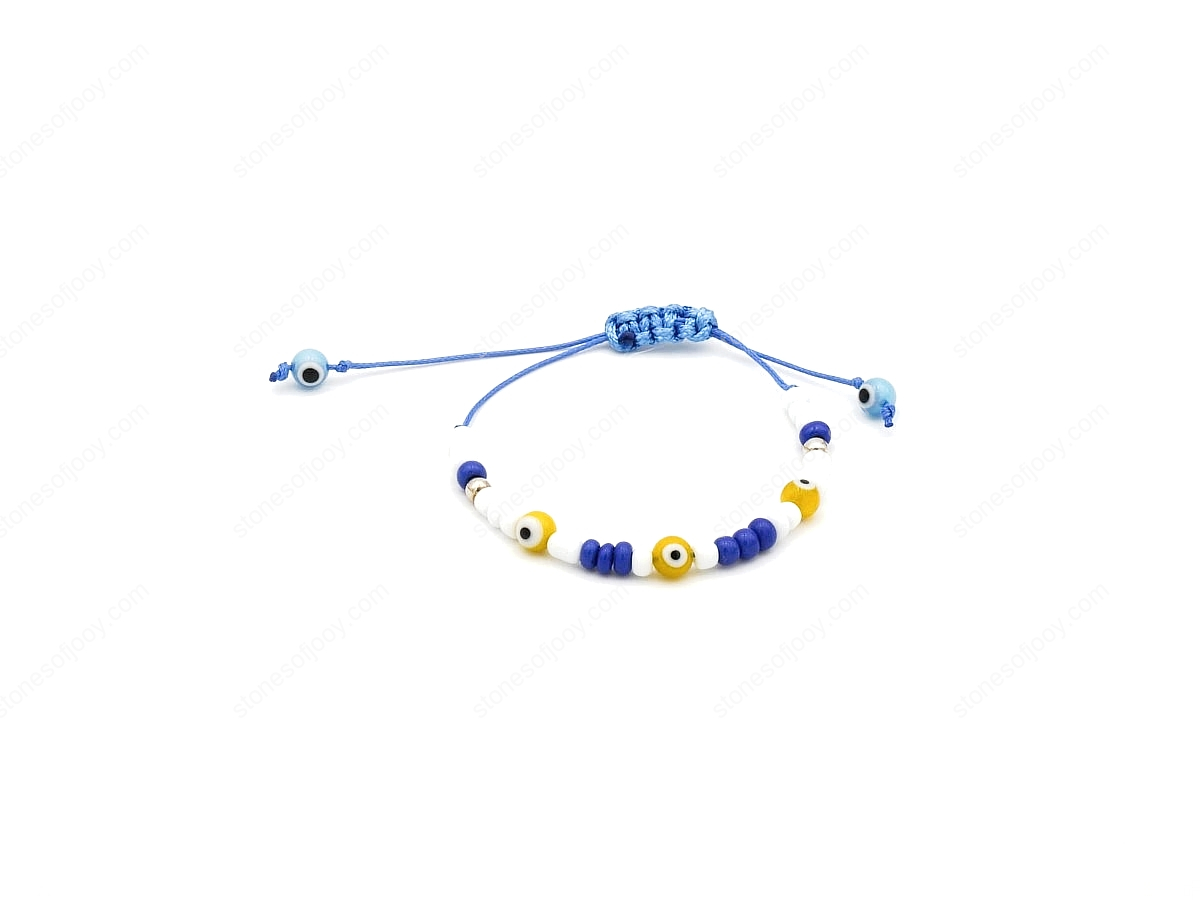 This different and beautiful Evil eye bracelet made of blue and white seed beads, silver plated spacers and unusual yellow and light blue Evil eye beads. Yellow represent health, fitness and protection, clarity… sharpen memory and concentration skills help against depression and improve your self-esteem. Set on a blue wax cord with a slide knot. Almost identical with bracelet SKU BRAC123. Also available in children’s sizes.
